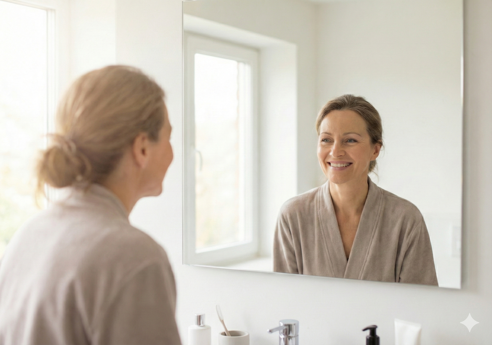 se olhar no espelho de manhã e, em vez de focar nas rugas ou no cansaço, você sorrisse para a mulher confiante e serena que vê refletida, sentindo orgulho de quem você é hoje.